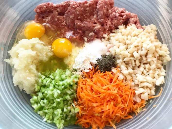 - In a large bowl, mix the ground pork, minced garlic, minced onion, minced celery, minced carrots, 2 large eggs, flour, salt and pepper. Mix well using your hand or a big spoon. Adjust seasoning as necessary. Set aside for 30 minutes to let the flavors blend.