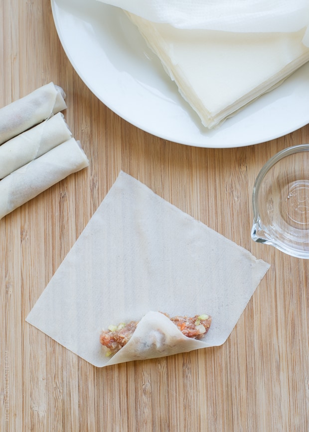 5. To roll the lumpia, place the wrapper on a flat surface diagonally. Place a tablespoon of filling towards the bottom of the wrapper. Turn up the bottom corner and roll upwards to the other end of the wrapper.
